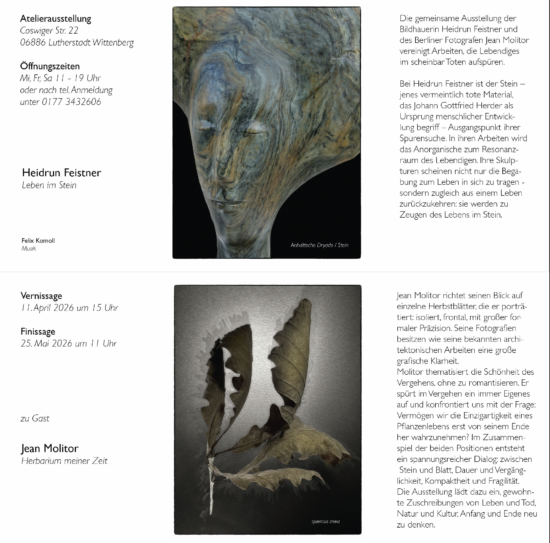 Ausstellung über Leben und Tod, Natur und Kultur, über Anfang und Ende von Heidrun Feistner: Leben im Stein und Jean Molitor: Herbarium meiner Zeit Vernissage mit dem Musiker Felix Komoll am 11. April um 15 Uhr