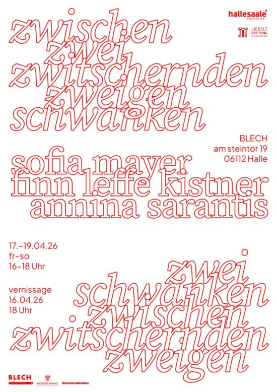 Ausstellung ‚zwischen zwei zwitschernden zweigen schwanken‘ Annina Sarantis, Finn Leffe Kistner und Sofia Mayer arbeiten aus einer verwandten künstlerischen Sprache heraus; zwischen den Formen, zwischen dem Gesagten. In zwischen zwitschernden zweigen schwanken treten ihre Arbeiten erstmals in einen Austausch. Im Malerisch-Zeichnerischen und Objekthaften verschieben sich die Grenzen zwischen Fläche und Körper, zwischen Setzung und Auflösung, […]