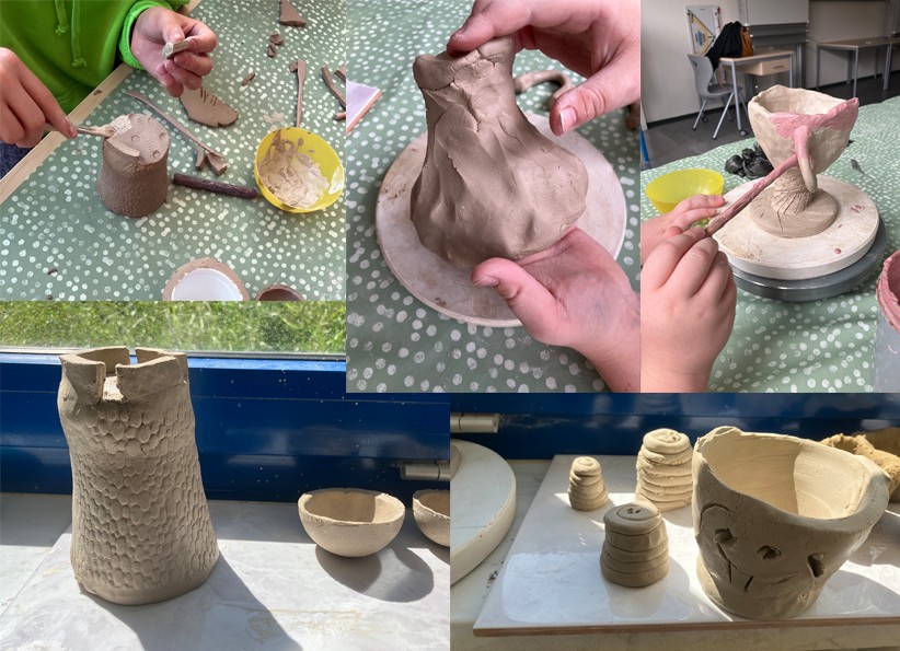 „Figur – Gefäß“ Die Wahl des Materials für dieses Projekt fiel auf Ton, da dieser sehr intuitiv genutzt werden kann. Nach der Einführung in Technik und Materialeigenschaften, konnte sich jeder individuell diesem Material bildnerisch nähern.